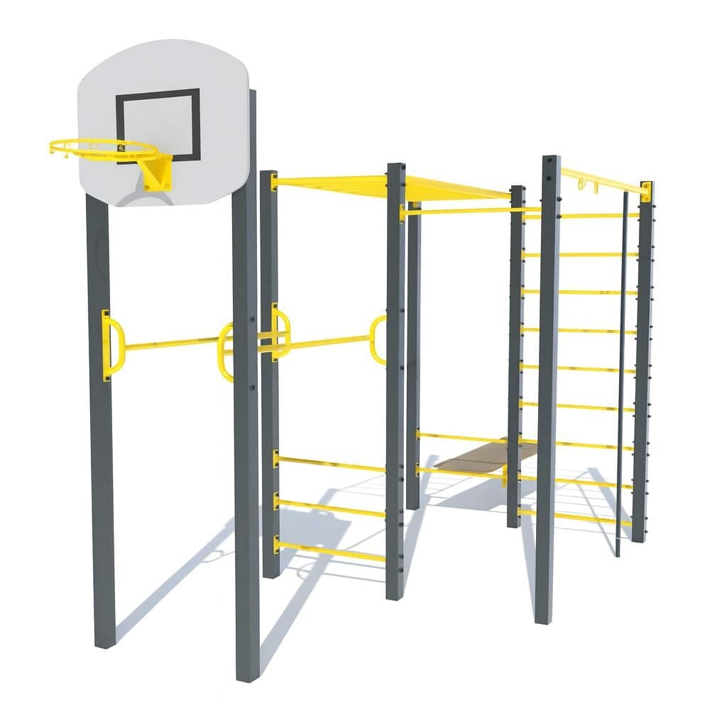 Гімнастичний комплекс GM604 – компактна спортивна модель для дітей і підлітків, які люблять активний спосіб життя та фізичні тренування. Він забезпечує розвиток сили, витривалості, координації рухів і спритності завдяки різноманітним турнікам, брусам і швецькій стінці. Оснащений лавою для тренування мʼязів пресу. А також баскетбольним кільцем, що робить його ще більш універсальним та цікавим для любого віку.