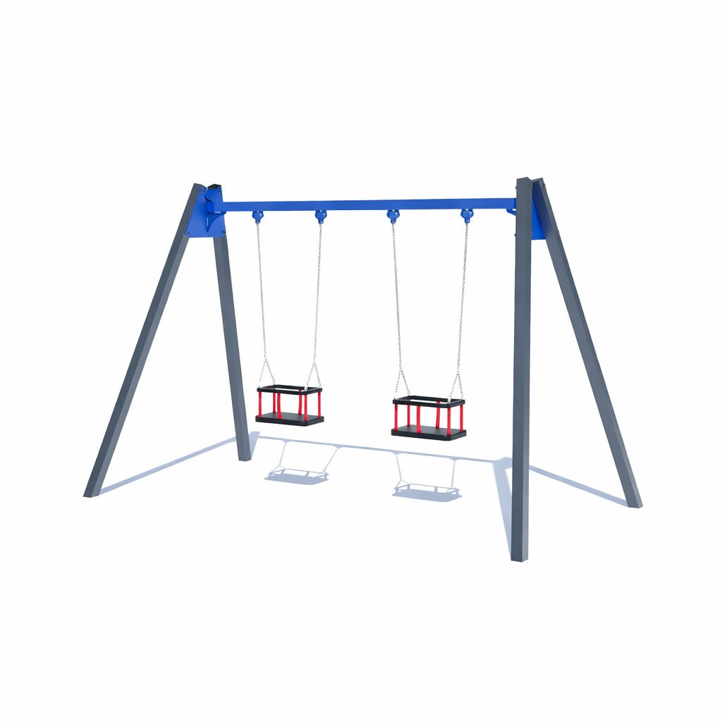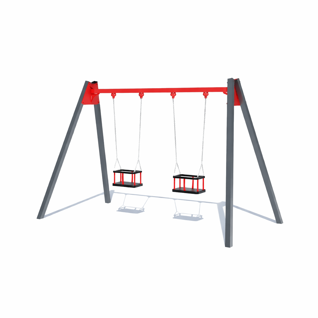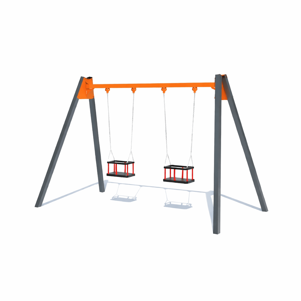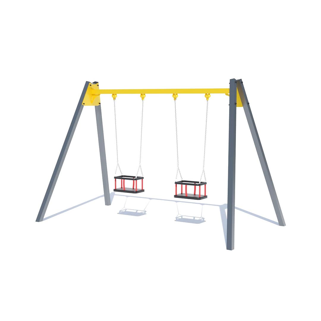 Гойдалка подвійна є універсальним обладнанням, оскільки може комплектуватись різними сидіннями в залежності від потреб клієнта. Дана модель укомплектована безпечними сидіннями на металевих опорах. Такі сидіння підходять для малюків від 8 місяців та інклюзивних діток. Може комплектуватись сидіннями: “Гніздо” – для діток від 1,5 року, гумові сидіння на ланцюгах, що розраховані на дітей більш старшого віку. При зміні сидінь вартість може змінюватись.