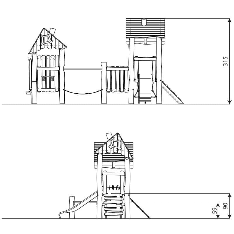 Ігровий комплекс “Хатинки” виконаний з цільних колод сосни в еко-стилі. За рахунок маленької висоти підходить для дітей молодшого віку, яким буде цікаво лазити сходинками та місточками та спускатися з гірки.