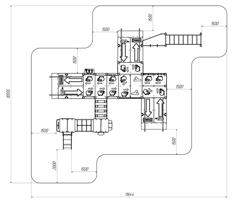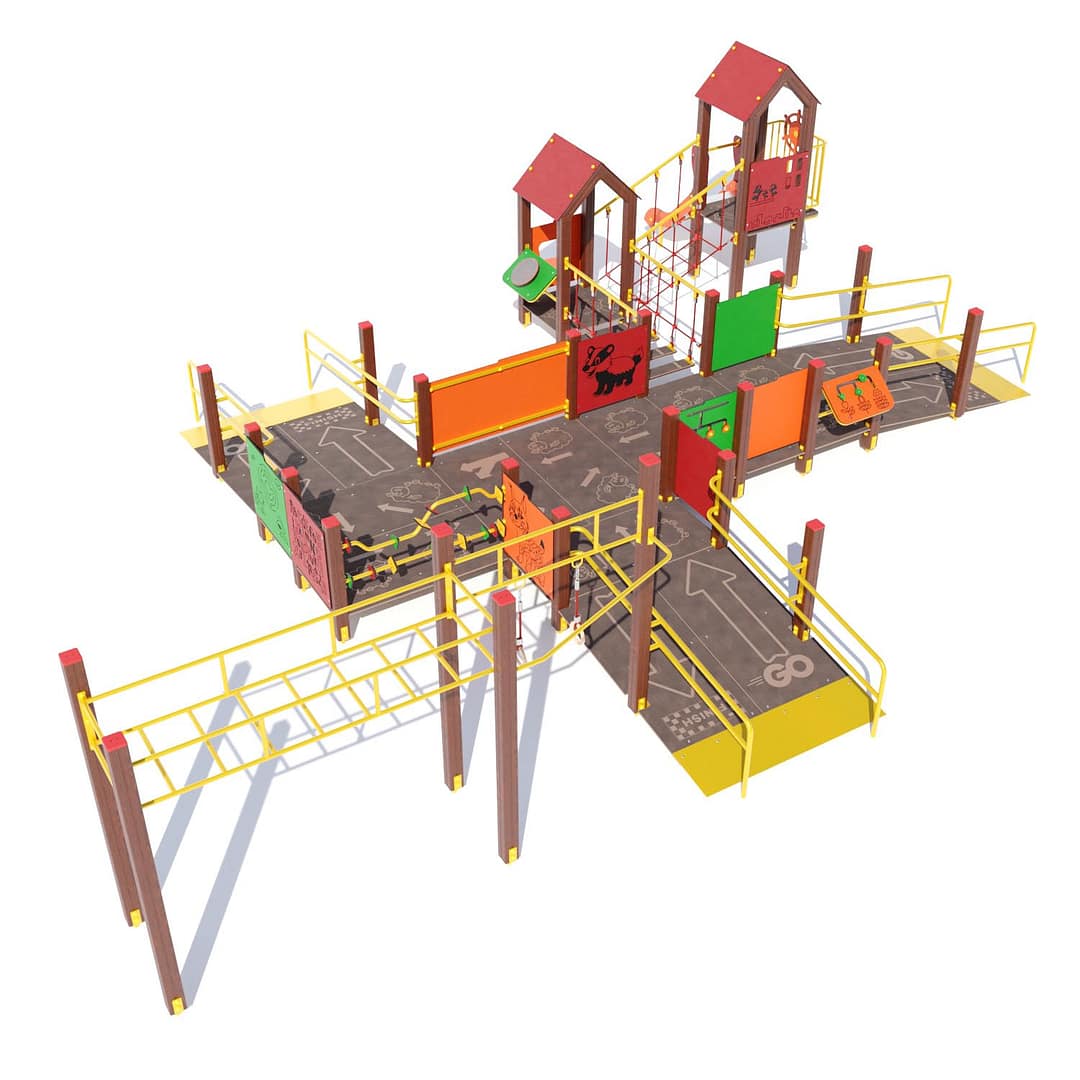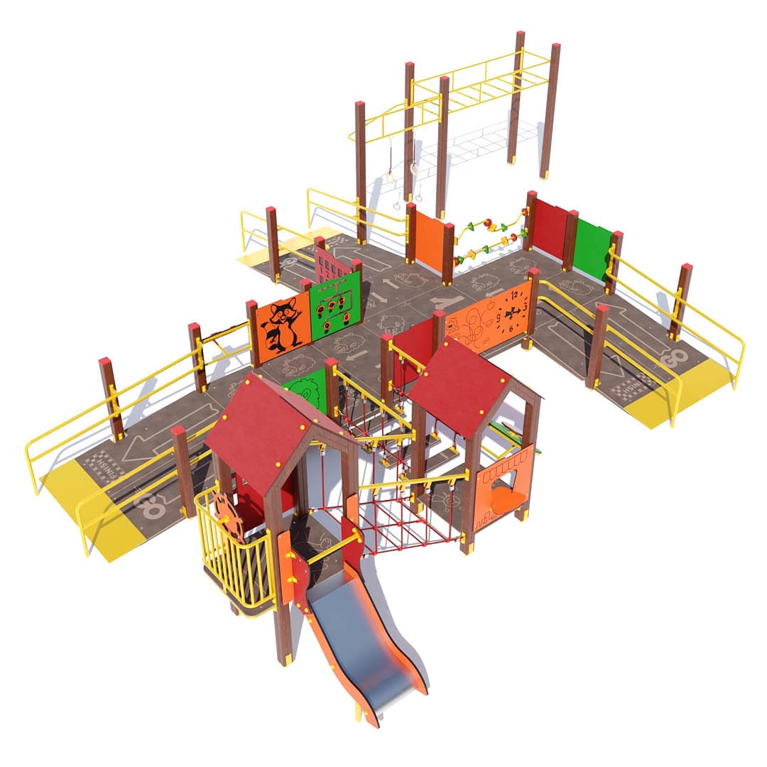 Ігровий комплекс “Активне містечко L” розроблений спеціально для діток з обмеженими можливостями. Проходи зроблені з врахуванням проїзду 2 візочків та з урахуванням кутів нахилу. Використані додаткові борти безпеки та заглушки з плавними кутами. Це великий комплекс, який обʼєднує різні заняття: гру, тренуваня та розвиток. Рукохід та бруси чудово підійдуть для виконання вправ на тренування мʼязів рук. А інтерактивні панелі розвивають моторику та логіку. Гірки, місточки та канатні лази додадуть драйву та веселощів у гру.