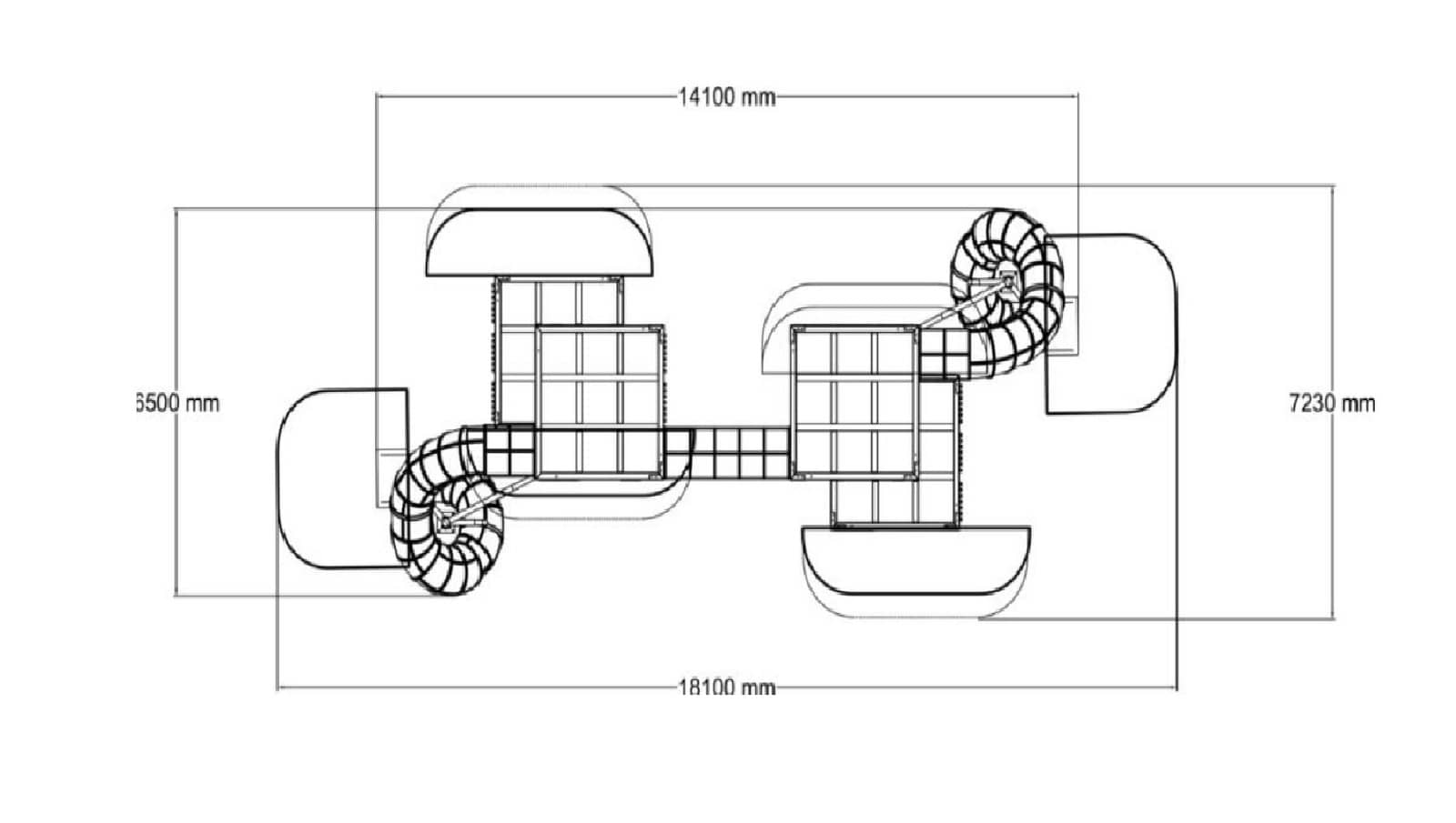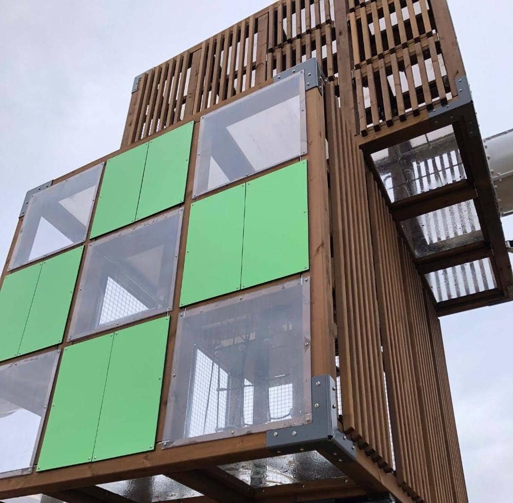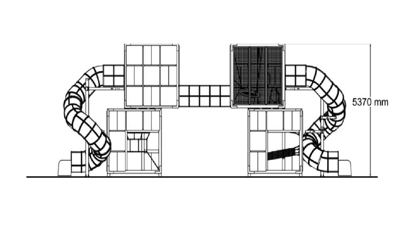Ігровий комплекс “Куб 4Х” – це найбільший комплекс колекції “Куби”. Він складається із чотирьох кубів і утворює дві окремі вежі, з’єднані інтригуючим тунелем. З самих верхніх кубів можна зʼїхати по захоплюючій гірці-трубі або спуститись по канатам всередені. Вежі зʼєднані між собою закритим тунелем на висоті 2,5 метрів. Всередені куб укомплектований елементами для лазіння, канатами і навіть гойдалкою. Комплекс може додатково комплектуватись LED-підсвіткою.