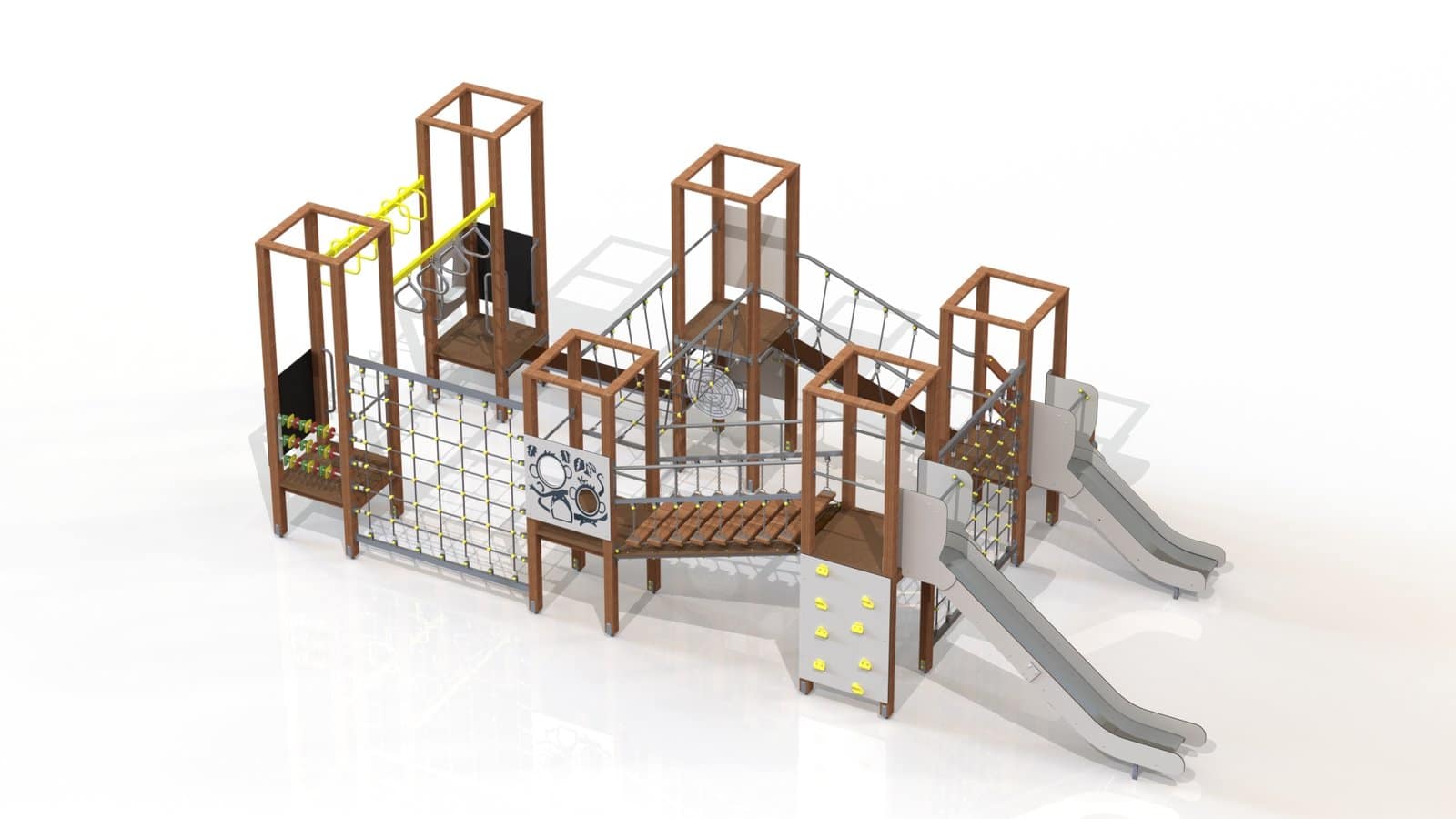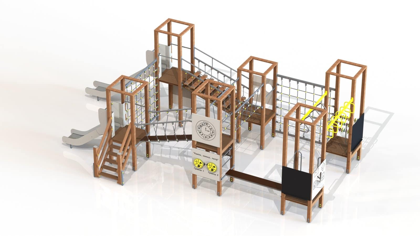 Ігровий комплекс “Вежі 6Х” – це великий ігровий комплекс, розрахований на дітей різного віку. Він складається із шести деревʼяних веж, поєднаних між собою різними лазалками, переходами та містками. Укомплектований розвивальними панелями та двома гірками. Продумана конструкція та різні рівні висоти та складності будуть цікаві і для маленьких, і для дорослих діток.