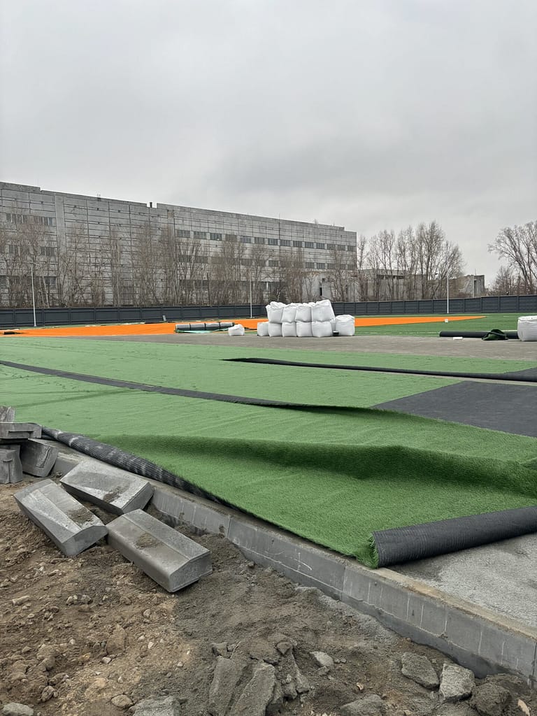 Довелось укладати резинове покриття в першу чергу, до холодів. Це потребувало вирізання в покритті отворів для бетонування закладних обладнання та подальшої ручної укладки резинового покриття навколо закладних.